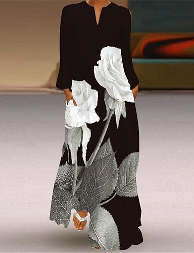 Damskie Długa sukienka sukienka maxi Sukienka w kwiatki Sukienka z nadrukiem Nowoczesny Codzienny Wyjściowe Weekend Regularny Kwiaty Długi rękaw W serek Niebieski Czarny Czerwony Zielony Wiosna Jesień