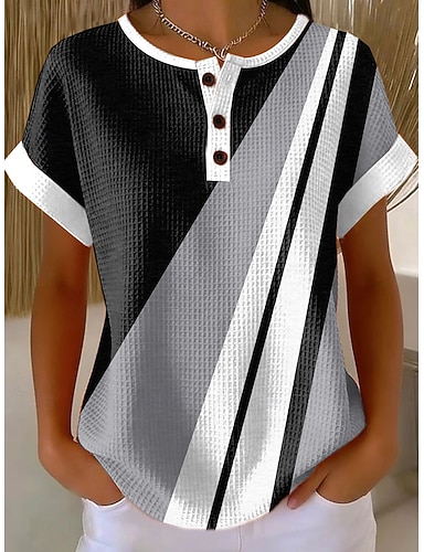 Damskie dzianinowe topy z teksturą waflową, ombre, grafika geometryczna, stylowy klasyczny, krótki rękaw, okrągły dekolt, henley, regularne topy, codzienne, sportowe, białe, tęczowe, letnie, wiosenne