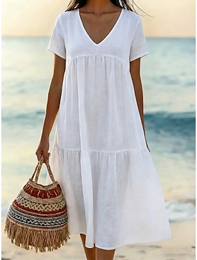 Damskie Sukienka midi Sukienka trapezowa Sukienka letnia Biała sukienka Sukienki z bawełny i lnu Codzienny Codzienny Urlop Luźna Równina Krótki rękaw W serek Niebieski Czarny Biały Rumiany róż Lato
