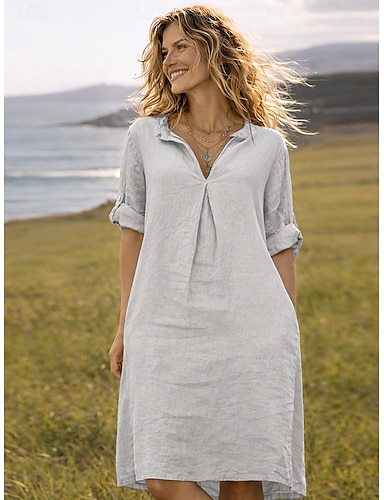 Damskie Sukienka do kolan Codzienne sukienki Bawełniana lniana sukienka Elegancja Moda Nowoczesny Na zewnątrz Urlop Wyjściowe Regularny Równina Krótki rękaw W serek Niebieski Czarny Żółty
