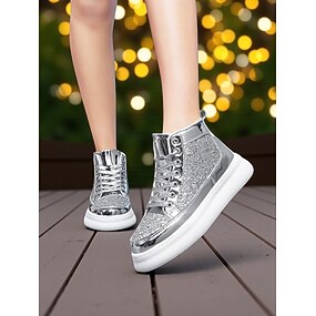 Damskie, srebrne, brokatowe, wsuwane buty na platformie — zdobione kryształkami, z amortyzowaną podeszwą, błyszczące, gotowe na imprezę, wieczorne wyjścia, festiwale i koncerty