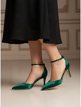 damskie szmaragdowozielone satynowe szpilki z paskiem wokół kostki - eleganckie szpilki ze szpiczastym noskiem na imprezy, wesela i specjalne okazje