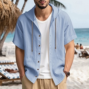 Męskie Koszula Koszula lniana Letnia koszula Stroje plażowe Bluza z kapturem Jednokolorowe Urlop Ulica Czarny Biały Błękit nieba Zielony Krótki rękaw Kaptur Lato Wiosna Odzież Kieszeń