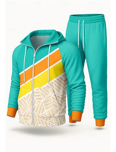 Męskie Bluza z Kapturem Dres Dres 2-częściowy Ściągana na sznurek Zapiąć na zamek błyskawiczny Geometryczny Zestawy odzież Jesień Zima Niebieski Pomarańczowy Kariera Na zewnątrz Podróże Lekki Moda