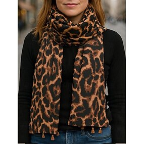 Damski szalik z frędzlami i nadrukiem w panterkę – miękki, lekki, obszerny szal z frędzlami, szykowny styl boho na jesień/zimę, do noszenia na co dzień, do biura, w podróż i na prezent