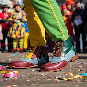 Kolorowe botki za kostkę dla mężczyzn na Mardi Gras czerwone niebieskie zielone i brązowe stylowy design na sznurówki z dekoracyjnymi perforacjami idealne na karnawał i święta