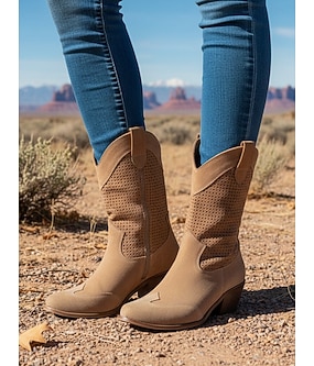 damskie perforowane zamszowe kowbojskie buty westernowe - jasnobrązowe, do połowy łydki, oddychające, letnie