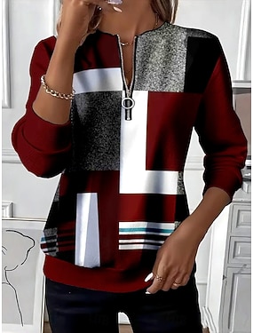 Damskie Bluza z kapturem Bluzy z zamkiem błyskawicznym Graficzny Geometryczny Kolorowy blok Moda Codzienny Długi rękaw Półgolf Zwykłe topy Ulica Na co dzień Niejednolita całość Zamek Nadruk Wino
