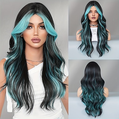 długa falista peruka dla kobiet ombre zielona środkowa część peruki turkusowe peruki długie kręcone syntetyczne włosy odporne na ciepło z naturalną linią włosów na imprezę cosplay codzienne
