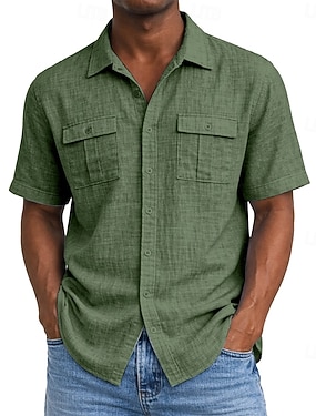 Męskie Koszula lniana Letnia koszula Stroje plażowe Zapinana na guziki koszula Równina Urlop Przeklęty Czarny Biały Jasnozielony Rumiany róż Krótki rękaw Wieczorne Lato Odzież