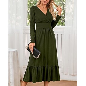 damska sukienka maxi na co dzień z długim rękawem, dekoltem w szpic, plisowaną talią i marszczonym brzegiem
