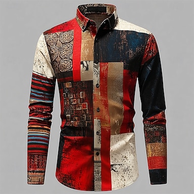 Męskie Kolorowy blok Wzór geometryczny Koszula Zapinana na guziki koszula Długi rękaw Moda Designerskie Codzienny Na zewnątrz Codzienny Święto Lato Wiosna Wieczorne Nadruk Przycisk w dół Czerwony