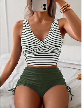 Damskie Stroje kąpielowe Bikini 2 szt Bezczelny Kostium kąpielowy Szczupła Odkryte plecy Urlop Stroje plażowe Prążki W serek Bez rękawów Kostiumy kąpielowe