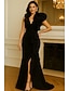 Czerwona czarna suknia wieczorowa typu syrena/trąbka, elegancka, formalna sukienka na wesele, długość do ziemi, krótki rękaw, okrągły dekolt, elastyczna krepa z falbankami 2025