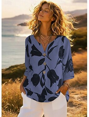 Damskie Bluzka Sztuczna bawełna len Guziki Nadruk Kwiaty Zabytkowe Elegancki Codzienny Rękaw 3/4 W serek Zwykłe topy Codzienny Święto Wyjściowe Biały Wino Czerwony Zielony Fiołkowy Lato Wiosna