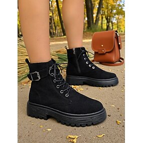 damskie czarne buty bojowe ze sztucznej skóry z podszewką ze sztucznego futra, sznurowane botki do noszenia na co dzień i na ulicy