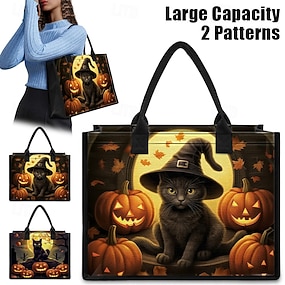 torba typu tote z motywem Halloween z czarnym kotem i motywem dyni - duża pojemność, wielokrotnego użytku torba na zakupy dla kobiet