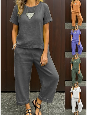Damskie Koszula Koszule bawełniane lniane Zestaw pościeli Zestaw 2-częściowa Jednokolorowe Moda Codzienny Okrągły dekolt Codzienny Ulica Niebieski Biały Khaki Szary Lato Wiosna Jesień Wiosna i jesień