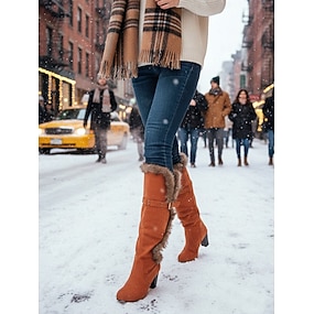 Damskie zielone zamszowe kozaki do kolan z wykończeniem ze sztucznego futra – detale w postaci klamry, gruby obcas, wygodne i stylowe na zimę, na co dzień i na wyjścia na zewnątrz