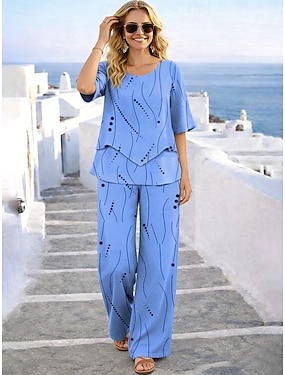 Damskie Zestawy spodni Rękaw 1/2 Okrągły dekolt Graficzny Geometryczny Elegancja Urlop Codzienny Urlop Niebieski Biały Fioletowy Lato Regularny