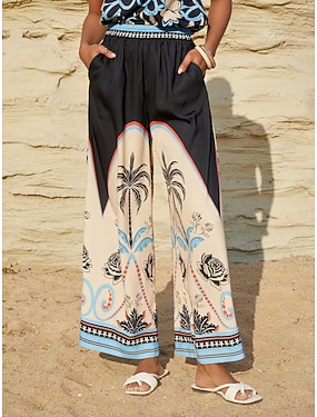 satynowe spodnie z szerokimi nogawkami i geometrycznym kwiatowym nadrukiem na co dzień i na wakacje
