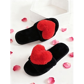 Damskie czarne, puszyste, sztuczne futrzane klapki z czerwonym pluszowym serduszkiem – wygodne, ciepłe, odkryte buty domowe na romantyczne Walentynki, do noszenia w domu i sypialni