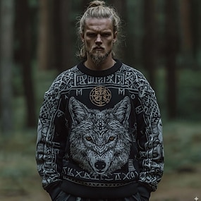 Męskie Zwierzę Wilk Wiking Sweter sweter Dzianina Wycięcie pod szyją Retro / vintage Codzienny Urlop Ulica Codzienny Druk 3D Dzierganie Zatrzymujący ciepło Długi rękaw Wiosna Jesień Zima Czarny