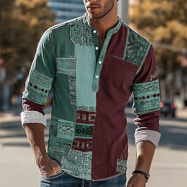 Męskie Geometryczny Kolorowy blok Niejednolita całość Koszula Koszula Henley Koszula ze stójką Długi rękaw Vintage Retro Urlop Codzienny Lato Wiosna Mandarynka Guziki Koszula z lnu Wino Niebieski