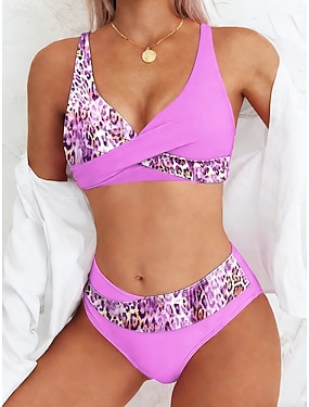 Damski bikini 2-częściowy kostium kąpielowy w panterkę z odważnym krojem bez pleców wakacyjny strój plażowy graficzny dekolt w serek bez rękawów