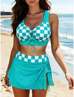 Damskie Stroje kąpielowe Bikini 2 szt Spódnica Kostium kąpielowy Wyszczuplenie brzucha Wysoka talia Szczupła Odkryte plecy Urlop Zabytkowe Graficzny Kratka Łódeczka Bez rękawów Kostiumy kąpielowe