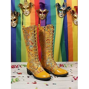 Żółte botki festiwalowe z haftem i wiązaniem – kolorowe wysokie botki na karnawały parady i świąteczne uroczystości