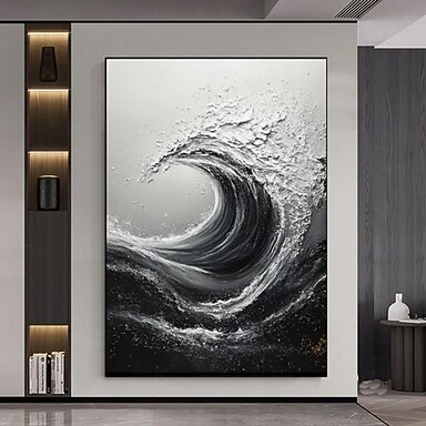 Obraz olejny malowany ręcznie, teksturowany, abstrakcyjny, fale morskie, ręcznie malowany obraz na płótnie, czarno-biały, fale oceaniczne, minimalistyczne, czarne dzieła sztuki, obrazy do nowoczesnego