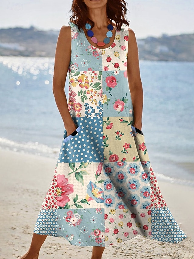 Rodzaj sukienki:Sukienka A line,Sukienka letnia,Materiał:Poliester,Płeć:Damskie,Wzór:Nadruk,Niejednolita całość,Graficzny,Kwiaty,Okazja:Święto,Styl:Urlop,Codzienny,Boho,Kategoria:Sukienka,Typ dopasowania:Luźna,Typ długości sukienki:Sukienka midi,Dekolt:Dekolt w kształcie litery U,Detale:Kieszonki,Długość rękawa:Bez rękawów,Elastyczność:Nieelastyczny,Pielęgnacja:Pranie w pralce,Pora roku:Lato,Wiosna,