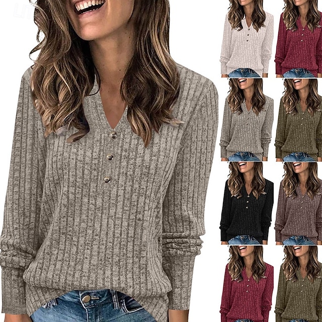 Damskie Podkoszulek Koszulka Guziki Jednokolorowe Elegancki Klasyczny Codzienny Długi rękaw W serek Zwykłe topy Codzienny Wyjściowe Weekend Czarny Zieleń wojskowa Czerwony Brązowy Khaki Wiosna Jesień