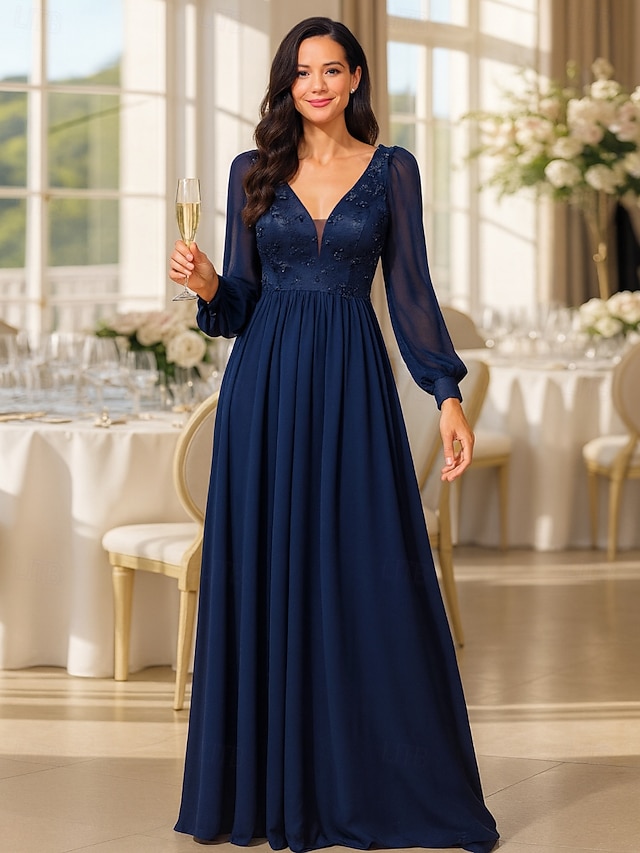 Krój A Sięgająca podłoża Sukienka dla gościa weselnego Suknia Suknia wieczorowa Sukienka dla matki panny młodej Długi rękaw W serek Elegancja Studniówka Wieczorna impreza Ślub Szyfon z Plisy