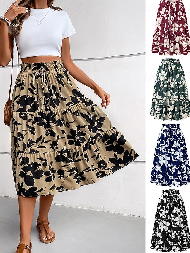 Damskie Elegancja Moda Codzienny Midi Wysoka talia Spódnice Kwiatowy Ściągana na sznurek Nadruk Średnio elastyczny Codzienny Ulica Granatowy Czerwone wino Czarny Zielony Lato #11751082