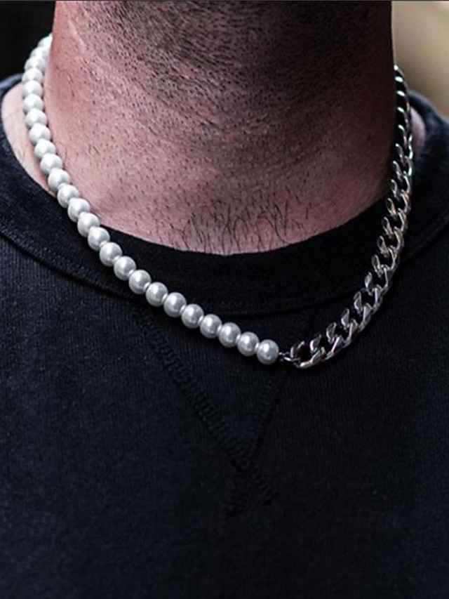 męski zestaw biżuterii z pereł i łańcuszków – modny naszyjnik i bransoletka z pół perły, pół metalu na styl uliczny, hip-hopowy i imprezowy #12195669