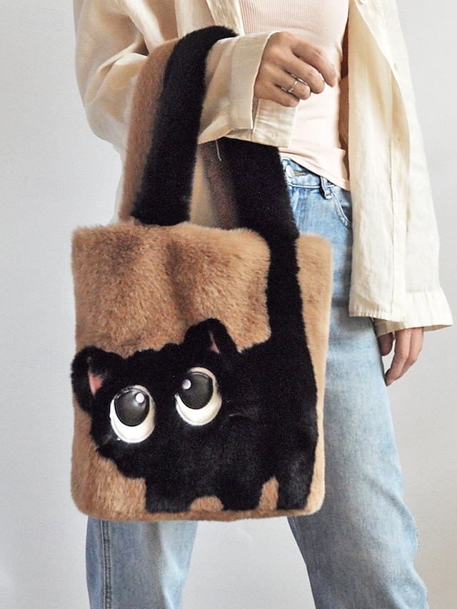 damska pluszowa torba typu tote z motywem kociej buzi, dostępna w wielu kolorach, z miękkiego futerka, o uroczym i zabawnym designie, idealna na niezobowiązujące wyjścia i jako prezent #12484076