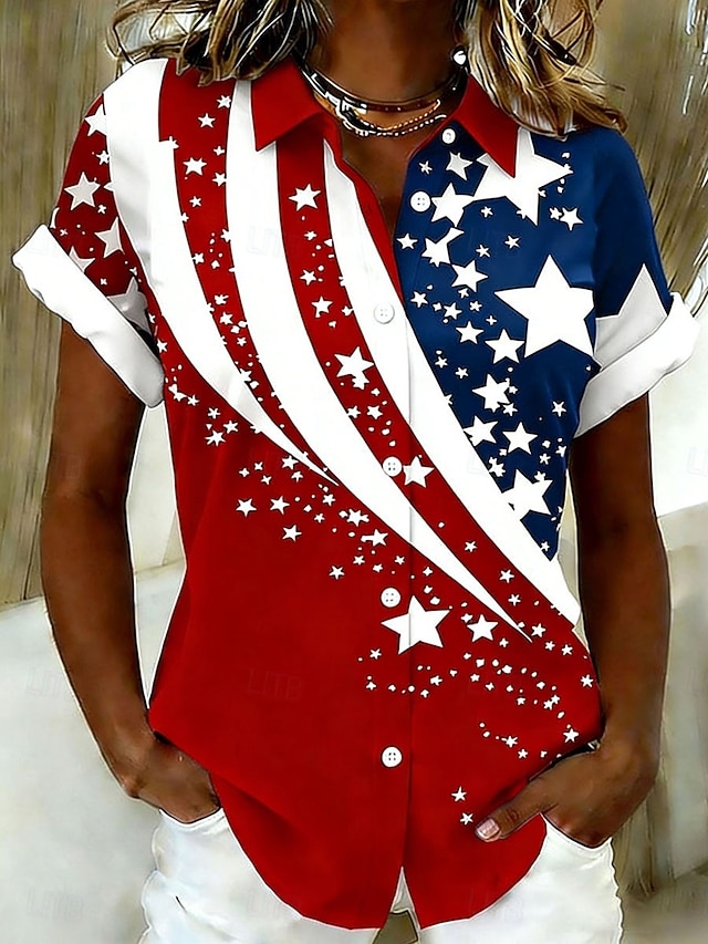 Materiał:Poliester,Rodzaj topu:Koszula,Płeć:Damskie,Okazja:Codzienny,Styl:Codzienny,Zabytkowe,Elegancki,Kategoria:Bluzka,Typ dopasowania:Regularny,Festiwal:Amerykański Dzień Niepodległości,Dekolt:Kołnierzyk koszuli,Długość rękawa:Krótki rękaw,Elastyczność:Nieelastyczny,Pielęgnacja:Czyszczenie na mokro i na sucho,Zmywalny,Pranie ręczne,Pranie w pralce,Długośc topu:Zwykłe topy,Wzór:Graficzny,Flaga,Pora roku:Lato,Wiosna,