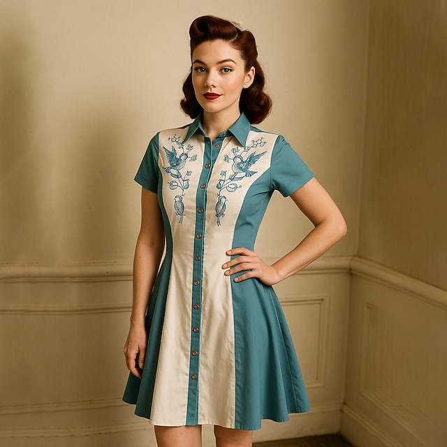 Płeć:Damskie,Rodzaje:Sukienka koszulowa,Sukienka z linii,Litery:kowbojka,Materiał:Poliester,Styl:Lata 50.,Retro / vintage,Dolna krawędź / Tren:Mini,Podkategoria:Sukienki,Wzór:Zapięcie na guziki,Druk 3D,Długość rękawa:Krótki rękaw,Elastyczność:Średnio elastyczny,Pielęgnacja:Czyszczenie na mokro i na sucho,Zmywalny,Pranie w pralce,TALIA (cm):S:80;M:85;L:90;XL:95;XXL:100,Szerokość ramion (cm):S:38;M:39.2;L:40.4;XL:41.6;XXL:42.8,DłUGOŚĆ RĘKAWA (cm):S:18.5;M:18.9;L:19.3;XL:19.7;XXL:20.1,Okazja:Urlop,Codzienny,Herbaciane przyjęcie,Wiek:Dla dorosłych,Motyw świąteczny:Bal maskowy,Pora roku:Lato,Zawartość opakowania:Sukienka,