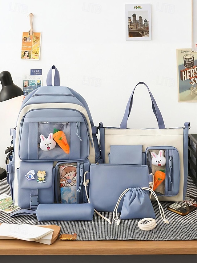 damski 6-częściowy uroczy plecak kawaii z przezroczystymi kieszeniami z przodu, przypinkami z kreskówek i pluszowymi zawieszkami, lekka nylonowa torba szkolna dla nastoletnich dziewcząt, do codziennego użytku na uczelnię#14205817