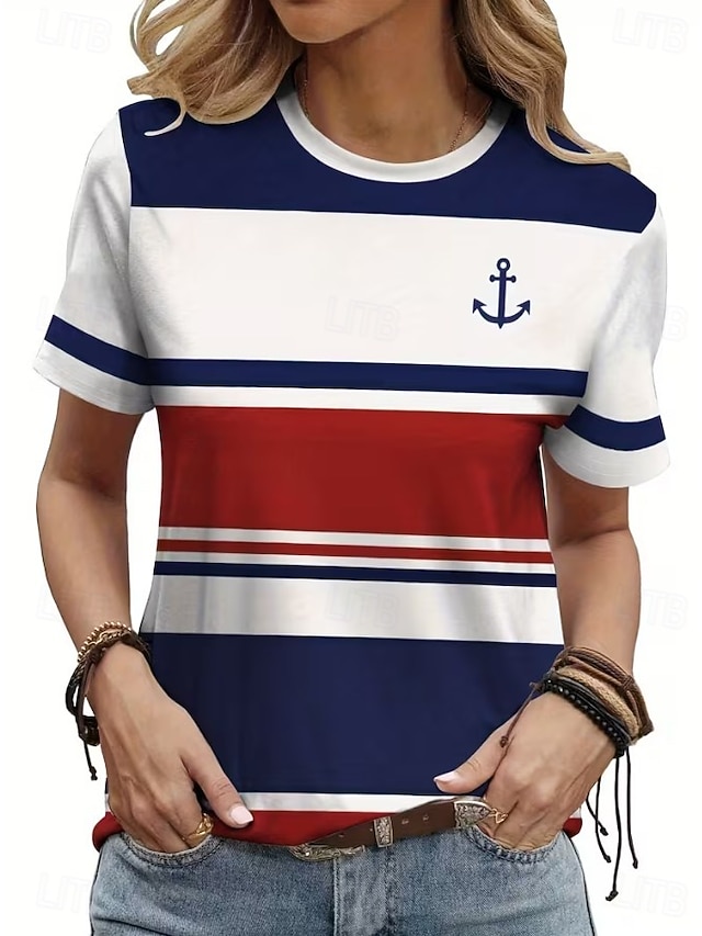 Amerykański Dzień Niepodległości Damskie Podkoszulek Nadruk Graficzny Flaga Zabytkowe Moda Elegancki Krótki rękaw Półgolf Zwykłe topy Codzienny Weekend Niebieski Rumiany róż Czerwony Lato Wiosna #14678728
