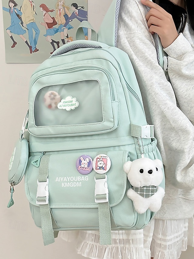 dziewczęcy plecak szkolny w kolorze makaroników - wodoodporny, o dużej pojemności, z ozdobnymi szpilkami, brelokiem w kształcie pluszowego misia i wieloma kieszeniami, odpowiedni dla nastoletnich uczennic i do codziennego użytku na uczelni#14711546