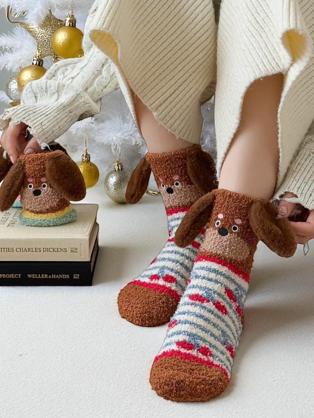 Damskie, przytulne, puszyste skarpetki świąteczne, urocze, ciepłe kapcie z motywem psa, idealne na świąteczny relaks &prezenty#15419487