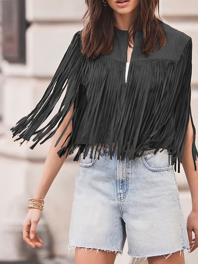 Damskie Bluzka Frędzel Równina Zachodni Bez rękawów W serek Zwykłe topy Święto Wyjściowe Czarny Jasnobrązowy Lato Wiosna #17278656