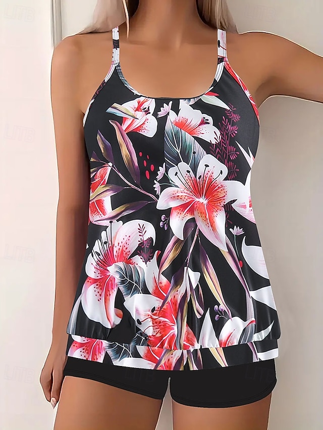 Damskie Stroje kąpielowe 2 szt Krótkie spodnie Kostium kąpielowy Odkryte plecy Urlop Stroje plażowe Kwiaty Dekolt w kształcie litery U Bez rękawów Kostiumy kąpielowe #17532019