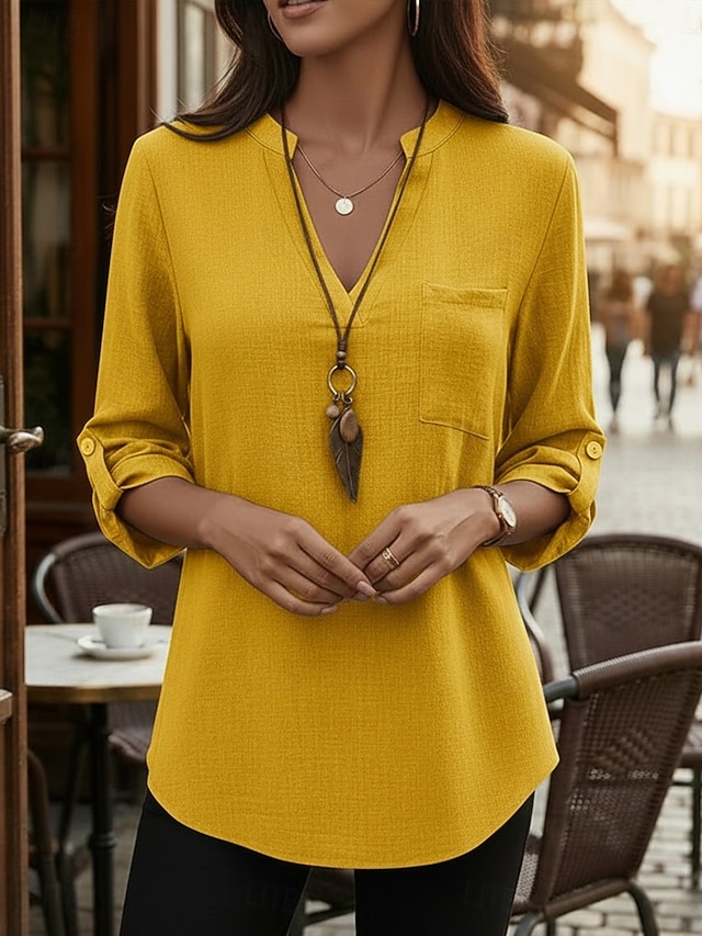 Damskie Koszule bawełniane lniane Letnie szczyty Bluzka Eleganckie topy Z marszczeniami Niejednolita całość Kieszeń Jednokolorowe Równina Elegancja Zabytkowe damska Rękaw 3/4 Kołnierzyk koszuli #18604383