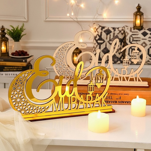 drewniana, pusta dekoracja z motywem księżyca i literą „mubarak” na ramadan i eid – złoty lustrzany akcent, idealna na ramadan, islamskie dekoracje świąteczne i domowe przyjęcia#18765306