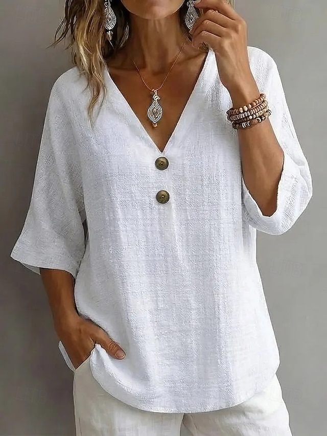 Damskie Bluzka Koszula z imitacji lnu Guziki Jednokolorowe Codzienny Elegancki Podstawowy Rękaw 3/4 W serek Zwykłe topy Codzienny Niebieski Biały Żółty Zielony Szary Lato Wiosna Jesień #18987766