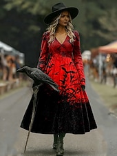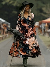 Rodzaj sukienki:Sukienka A line,Materiał:95% poliester, 5% spandex,Płeć:Damskie,Wzór:Z marszczeniami,Graficzny,Czaszka,Okazja:Codzienny,Styl:Urlop,Codzienny,Typ dopasowania:Regularny,Festiwal:Halloween,Typ długości sukienki:Sukienka midi,Dekolt:W serek,Długość rękawa:Długi rękaw,Elastyczność:Nieelastyczny,Pielęgnacja:Pranie ręczne,Pranie w pralce,Pora roku:Jesień,Zima,